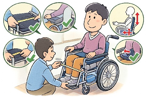 - クッションだけでなく 車椅子そのものが身体に合っているかの確認が必要