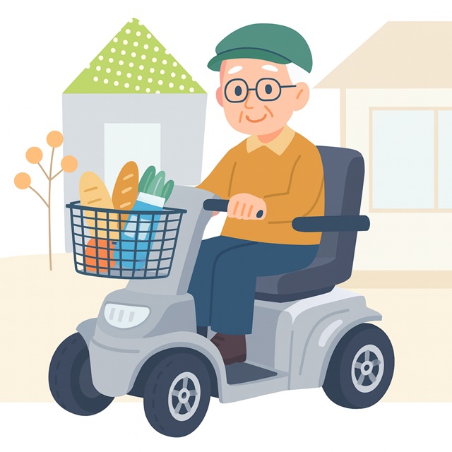 電動シルバーカーとは、モーターによって自走することができ、足腰が弱いかたでも長距離を移動したり、歩行の負担を軽減したりするために利用します。