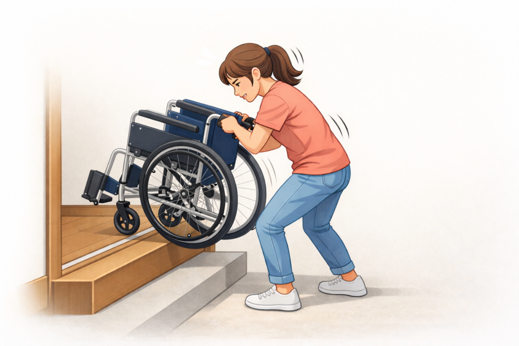 - 玄関などで段差を持ち上げる場面がある:玄関の上がり框のように段差が高く、スロープを常設しにくい環境では、車椅子を持ち上げて移動させる場面が出やすくなります。